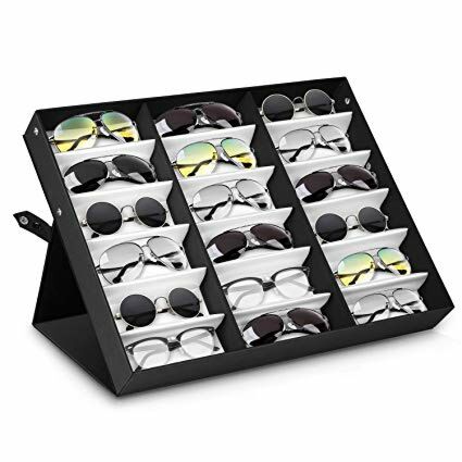 Бокс предназначен для демонстрации и выкладки очков на витрину. Выполнен из плотного картона обтянутого черной непромокаемой тканью, внутри разделен на отсеки, обшитые белым атласом, рассчитан на 18 очков. Под основной крышкой оснащена вторым прозрачным клапаном, который позволяет демонстрировать изделия, защищая их от пыли. Для более удобного использования специальная застежка позволяет менять угол наклона всего бокса.